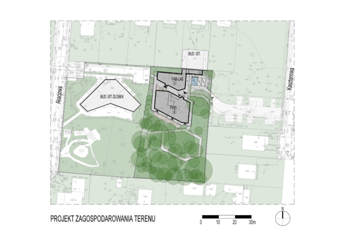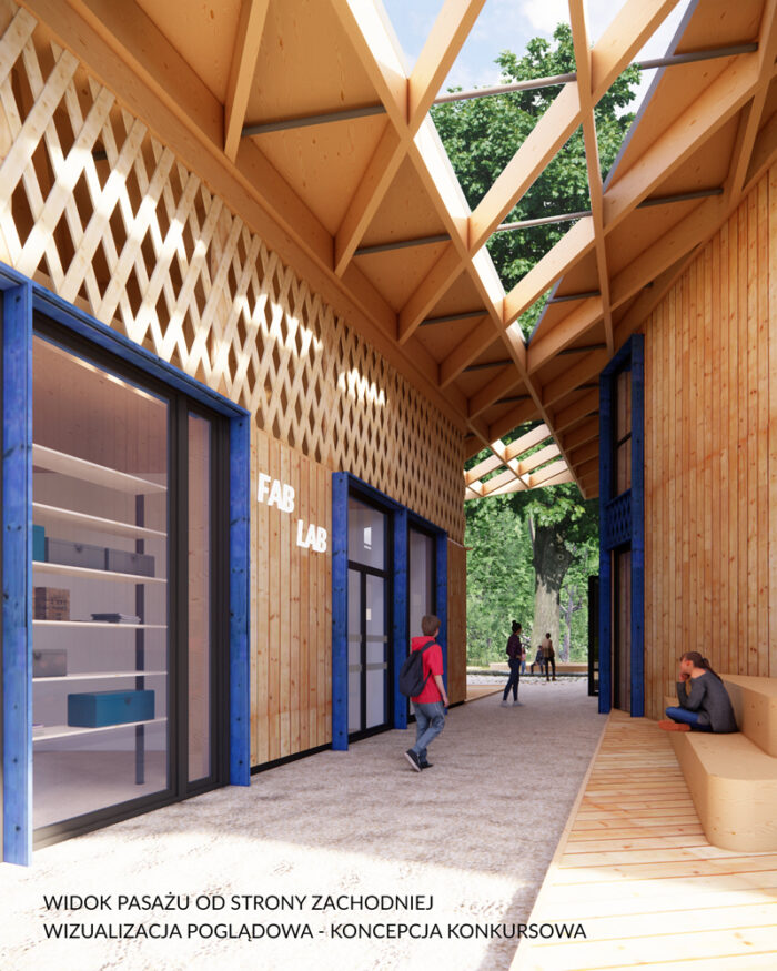 Projektowany obiekt to zespół dwóch budynków (PWD i FAB-LAB) połączonych zadaszoną strefą wejściową. Podział funkcjonalny na dwa oddzielne budynki był odpowiedzią na potrzeby Inwestora, ale stworzenie wspólnej przestrzeni wejściowej ma na celu integrację i wzajemne poznawanie użytkowników. Przestrzeń wejścia jest jednocześnie miejscem spotkań grup przed zajęciami. Strefa spotkań nanizana jest na oś przejścia łączącego dojścia do obiektu od strony wschodniej i zachodniej. Podkreśleniem wspólnoty jest również jeden dach, który domyka kompozycję pasażu ukierunkowanego na najokazalsze drzewo – pomnikowy klon. Nieregularne kształty budynków mają być jak najlepiej wkomponowane w istniejącą zieleń oraz otaczające obiekty i kierunki komunikacyjne.