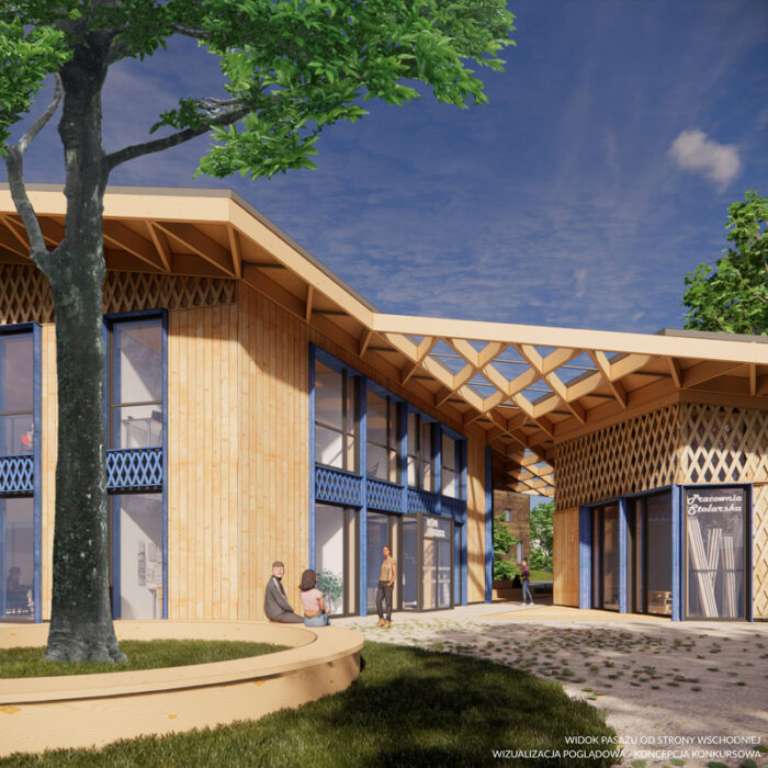 Ważny jest dla nas genius loci, który odczytaliśmy poprzez nawiązanie detalem do charakterystycznej drewnianej zabudowy na tym terenie. W bezpośrednim sąsiedztwie istnieje przykład takiego budynku. Główny motyw rombu powtarza się w naszym projekcie w formie konstrukcji dachu czy ażurowego fryzu. Jest to nasza interpretacja snycerskich dzieł dawniejszych budowniczych.