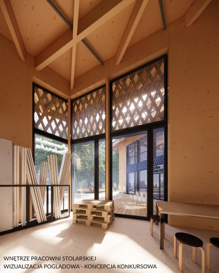 Projekt zwyciężył w konkursie na koncepcję Placówki Wsparcia Dziennego wraz z pracownią FAB-LAB w Dzielnicy Wesoła.